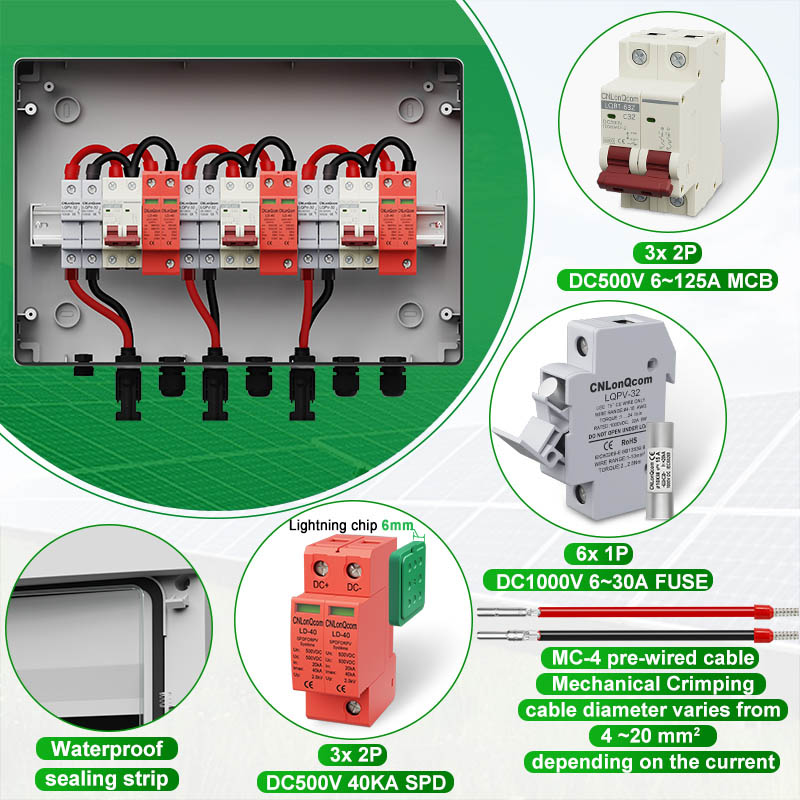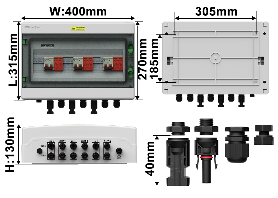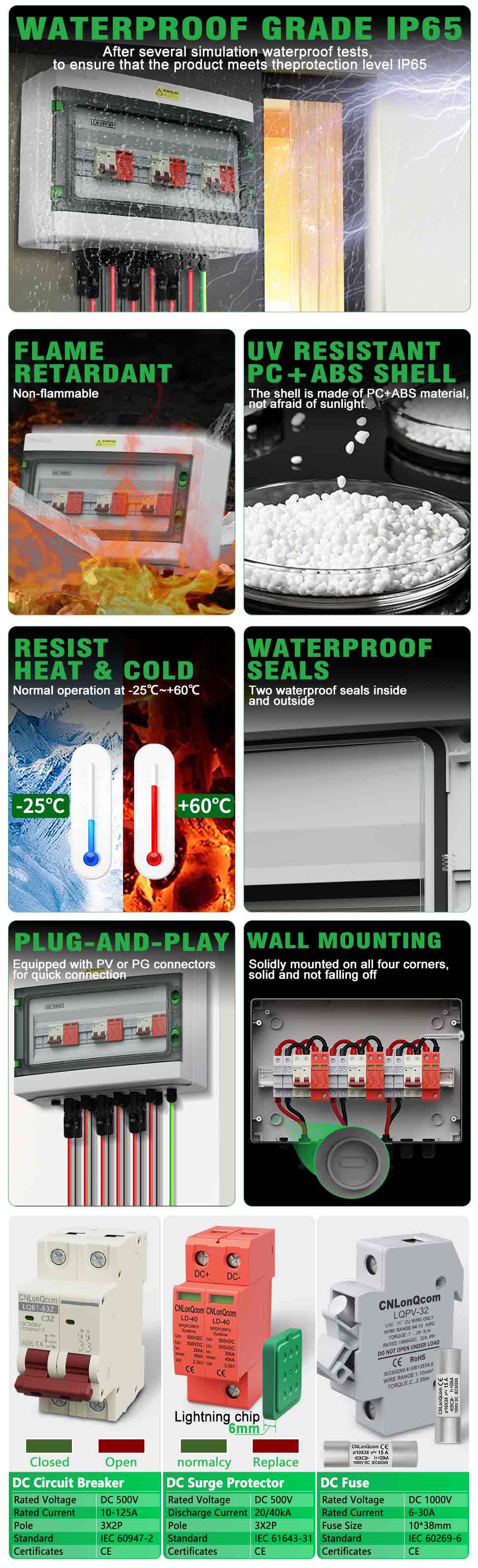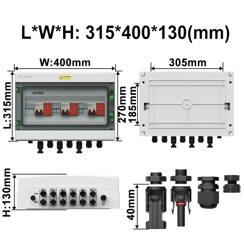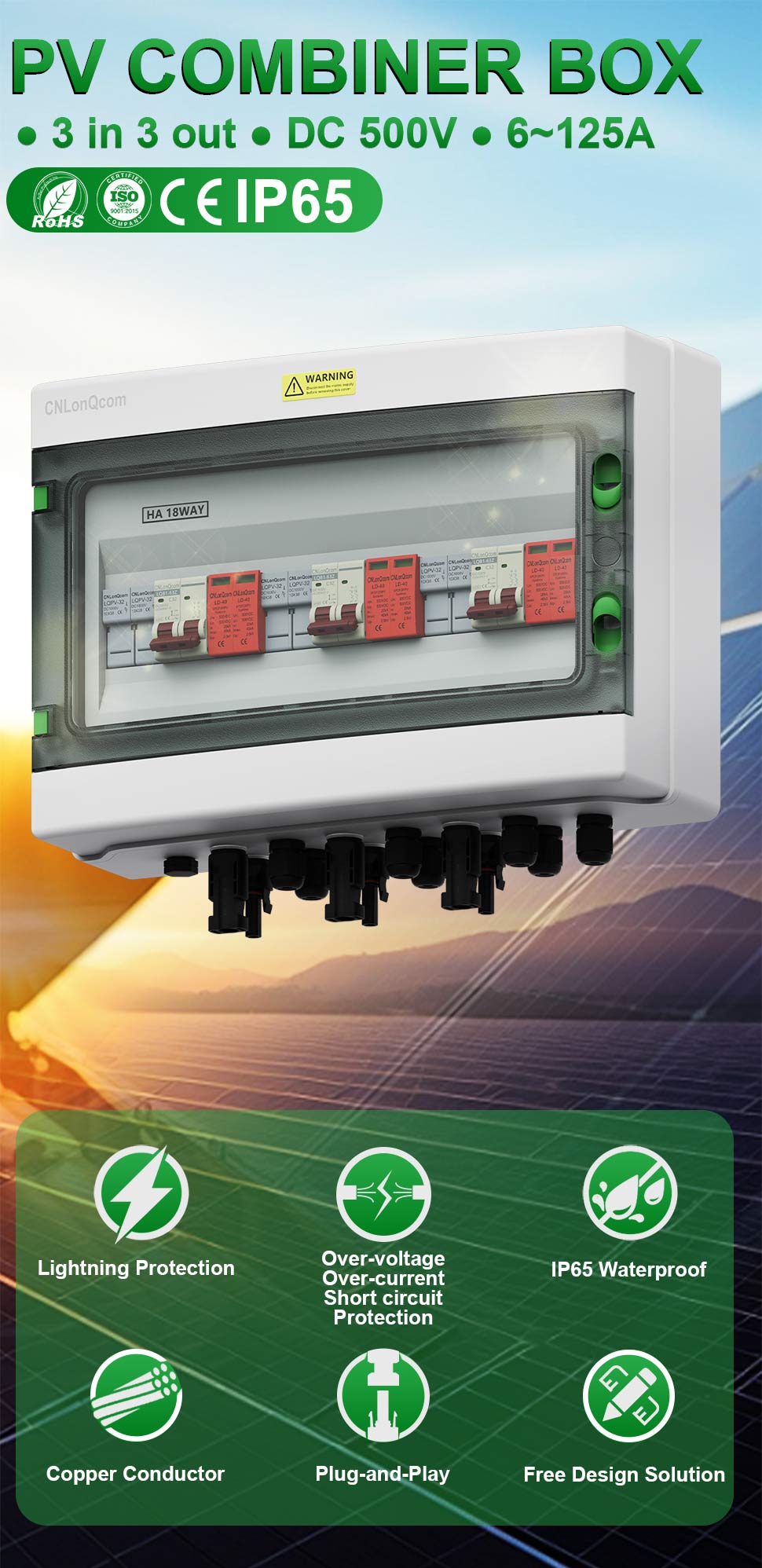 CNLONQCOM کا HA سیریز پلاسٹک PV کمبینر باکس 3 میں 3 آؤٹ DC500V میں مہر بند تعمیر ، اوورلوڈ پروٹیکشن ، شارٹ سرکٹ پروٹیکشن ، اوور وولٹیج پروٹیکشن ، دھول ، نمی اور بجلی کے تحفظ کے ساتھ ایک پی سی+اے بی ایس واٹر پروف کیس ہے۔